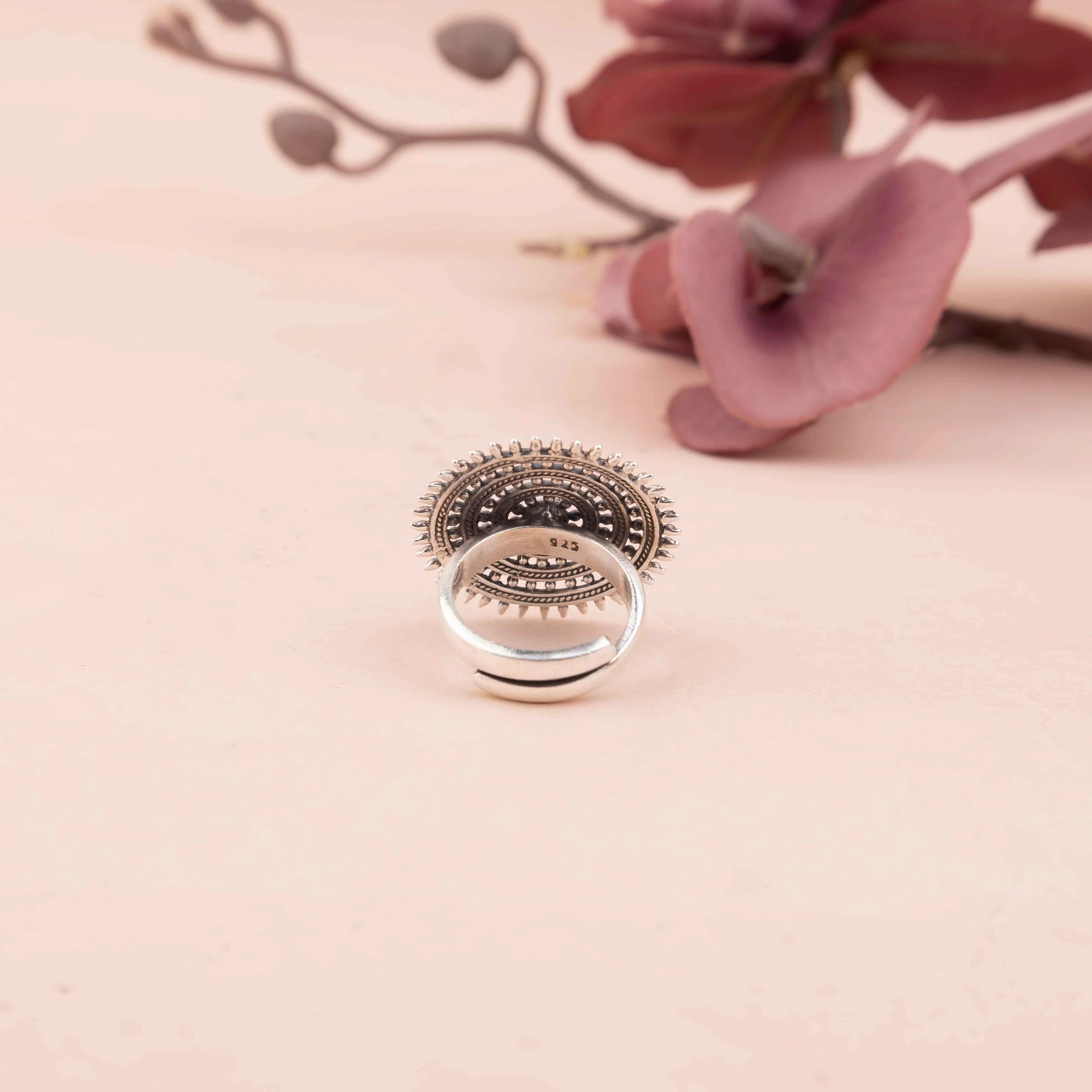 Crafted in 92.5 sterling silver with a 92.5 purity stamp, the Adya Fine Chakra Ring features a delicate circular design with intricate chakra-inspired carvings and a central gemstone accent. Its refined craftsmanship and elegant finish make it a standout piece for women’s fashion jewelry. Perfect for wedding jewelry, elegant accessories, and handcrafted silver rings, this premium silver ring adds a touch of spiritual elegance to any outfit, ideal for festive celebrations and cultural events.