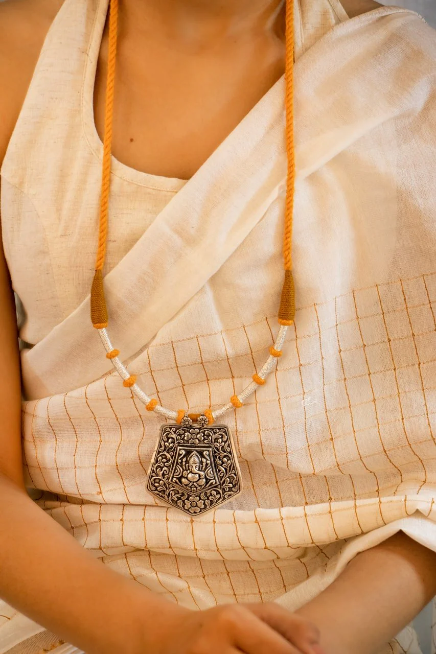 The Anvaya Ganesha Chitai Statement Dori Necklace is a spiritual slay, featuring a silver Ganesha pendant with intricate carvings, strung on a vibrant orange dori with tassels for a bold touch. Inspired by the warm vibes of a temple fest, where Ganesha's blessings light up the air, this unique piece brings divine charm to your style.