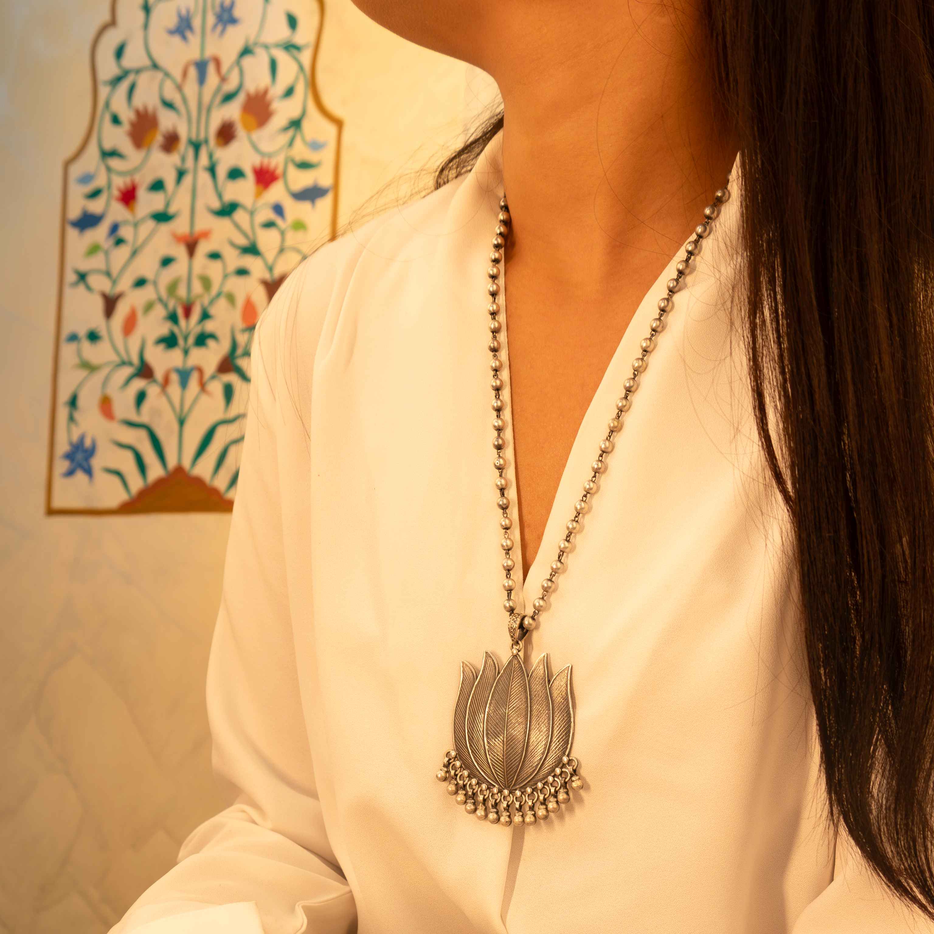 THE SHYLE TIP: Let this bold lotus pendant be the hero of your look, pair it with a solid kurta, a linen saree, or a deep-neck blouse to let the detail shine