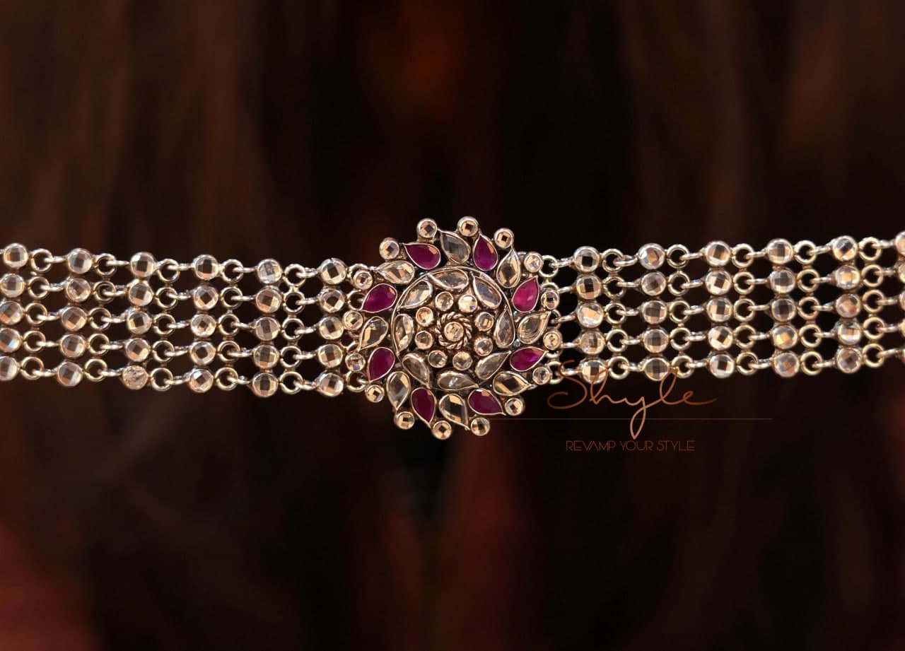 This magnificent choker features intricate embossed motifs with multiple layers of scintillating chainwork that creates a mesmerizing tapestry of light and texture, like armor worn by warrior queens who understood that true power comes from combining strength with breathtaking beauty. The detailed central medallion anchors cascading chains that move like liquid silver with every gesture, while embossed patterns tell stories of ancient craftsmanship.