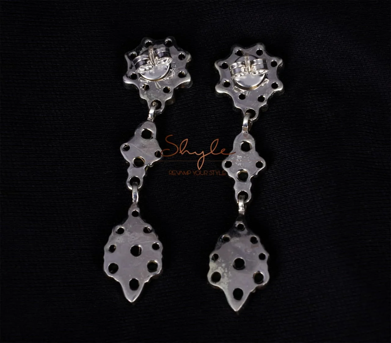 The Essence Flower Motif Leaf Drop Earrings feature an intricate combination of floral and leaf motifs with a polished silver finish, crafted through masterful handcrafted techniques using 92.5 silver. Inspired by the timeless elegance of traditional Indian jewelry, each earring blends detailed artistry with enduring strength, creating a piece that feels both classic and nature-inspired.