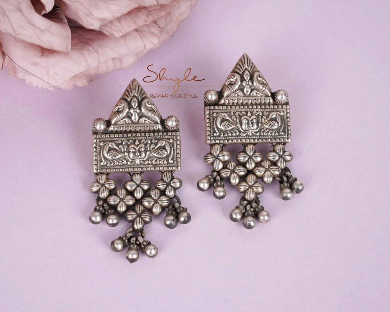 THE SHYLE TIP : The Mizoya Tribal Peacock Detailed Jali Earrings are designed to be a showstopper, perfect for enhancing your ethnic wardrobe. Their intricate detailing and substantial presence make them ideal for complementing grand outfits like heavy silk sarees, elaborately embroidered lehengas, or ornate Anarkali suits. They are perfectly suited for weddings, major festivals, or any occasion where you want to make a truly regal and unforgettable impression, showcasing the splendor of Indian craftsmanship. For a more subtle yet impactful look, pair them with a solid-colored, minimalist ethnic outfit to allow their intricate details and the graceful peacock motif to truly shine.