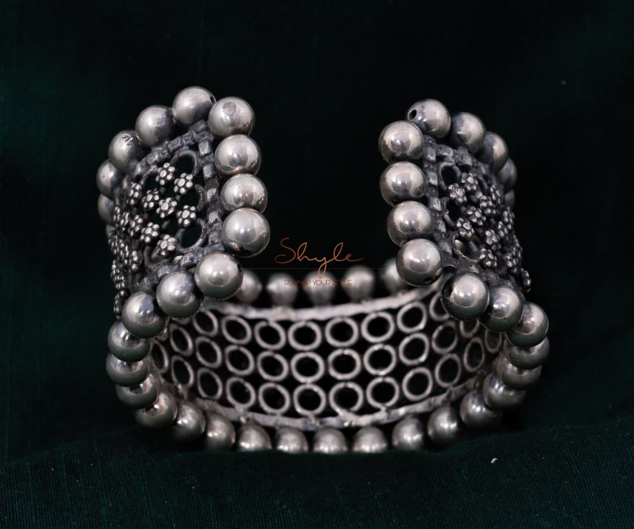 Make a bold statement with the Tattva Detailed Flora Broad Jali Kada, where nature's poetry is woven into precious metal. This striking wide cuff bracelet features an intricate floral jali pattern that creates a mesmerizing lattice of light and shadow across your wrist. Bordered by lustrous silver beads that catch and reflect light with every movement, this masterpiece transforms traditional craftsmanship into contemporary luxury. The detailed openwork design allows your skin to breathe while creating an enchanting visual depth that speaks of refined elegance.