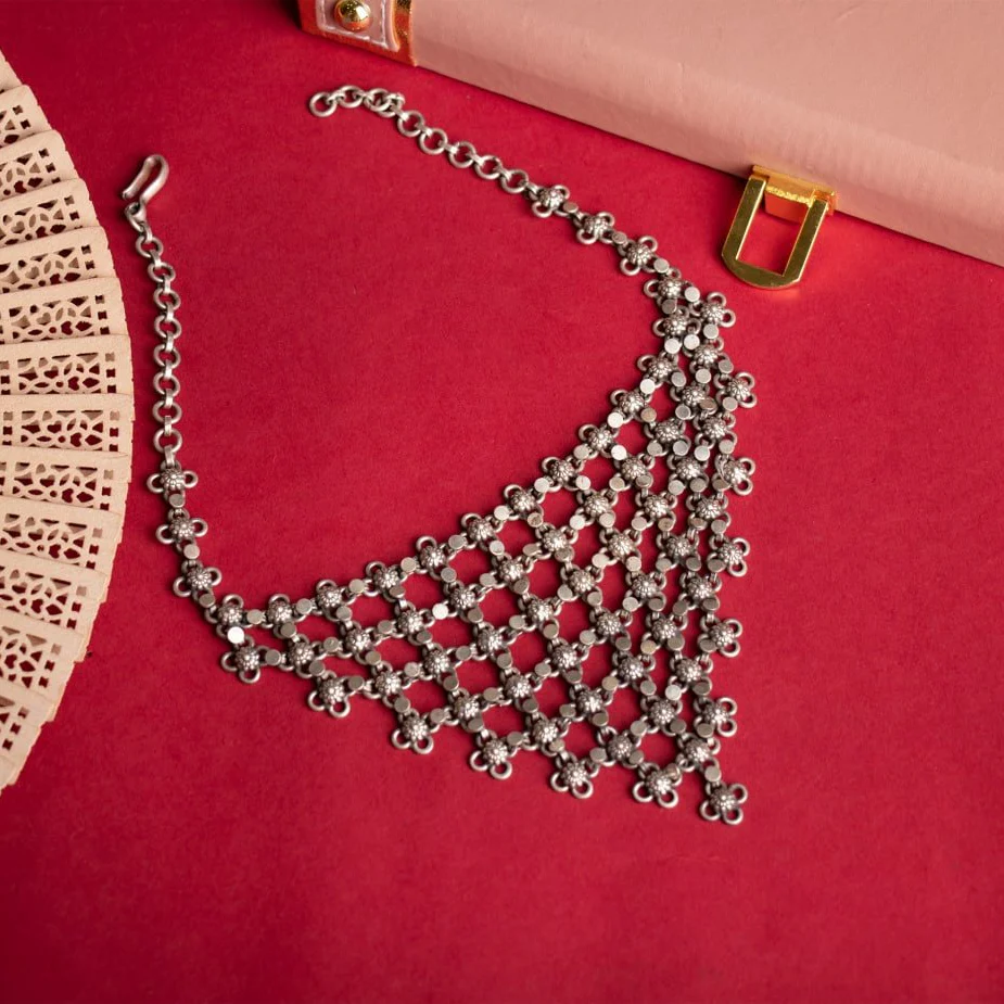 This ornate oxidised silver choker is crafted in a cascading net pattern. Each intersection features a delicate floral or beaded motif, creating a shimmering, vintage-inspired look. The design tapers beautifully towards the centre, forming an elegant triangular drop that enhances the neckline. Its intricate links offer fluid movement, making the piece both statement-making and graceful. The oxidised finish gives it a traditional yet timeless character, perfect for festive and ethnic styling.