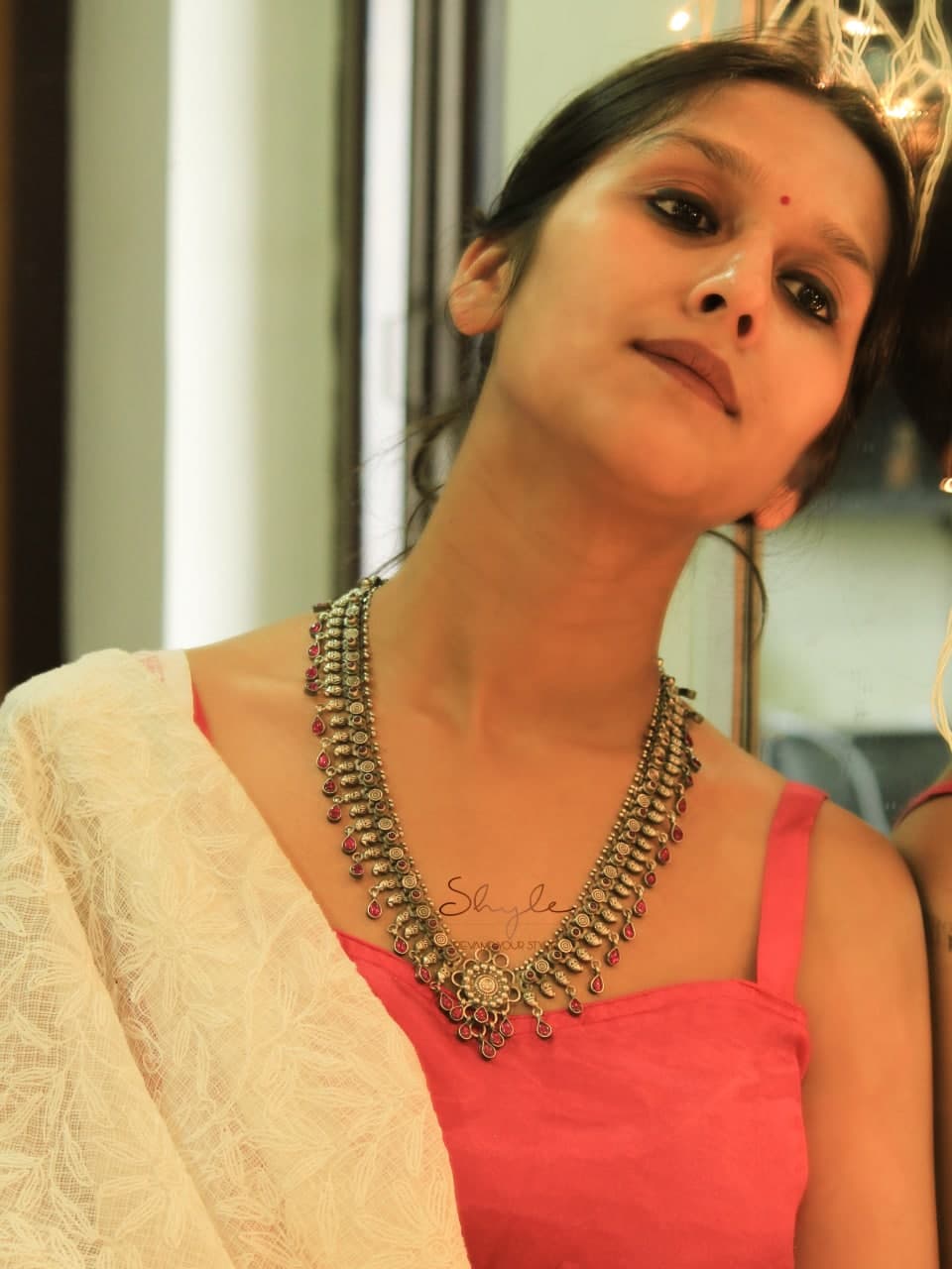 In the grand durbar halls where empresses held court, the most magnificent jewels were those that commanded silence with their sheer presence - statement pieces that spoke of power before a single word was uttered. Our Tattva haar channels this imperial authority through cascading tiers of intricate jadau work, each silver element meticulously hand-set with ruby-red drops that fall like precious tears of joy. The elaborate multi-layered design creates a waterfall of brilliance around your neckline, with every curve and contour reflecting the architectural grandeur of ancient palaces.Â